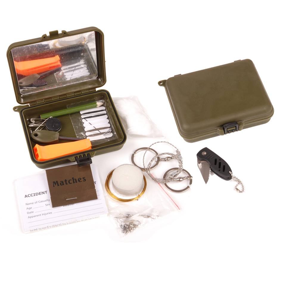 Combat survival kit waterproof. Deze Survival Kit bevat de volgende componenten; – Verband – Zaag – Lucifers – Vuurstaaf – Kompas – Potlood – Waxine kaart – Draad – Watten – Condoom (waterzak) – Zout – Vishaak…